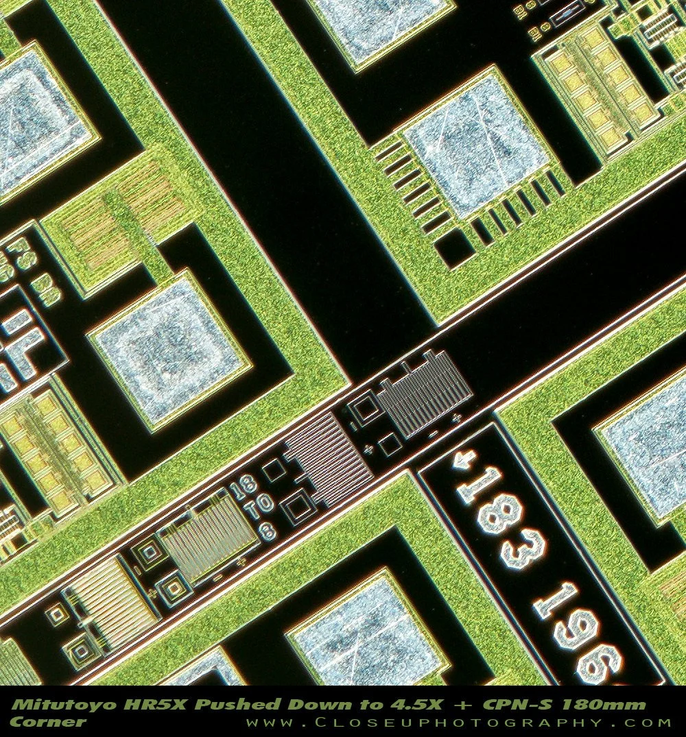 The HR5X produces tack sharp fine details without any trace of chromatic aberrations anywhere in the frame. This Dallas Semiconductor disk is one of my most used wafers and this is the best image quality I’ve ever seen at 4 or 5x. Due to the high contrast of this wafer, all but the very best lenses will show color fringing, but the HR5X shows no chromatic aberrations at all. This wafer image was made in Pixel Shift Multi Shooting mode, and not using any focus stacking.